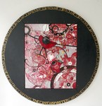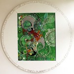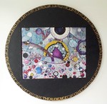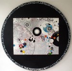 Cirque maakte ik in 2005. Het zijn doeken van 1 meter bij 80 cm. Ik heb ze ingelijst in een rond paneel wat bestaat uit vier delen van MDF. De titel staat verstopt tussen de letters in de ronde rand.