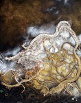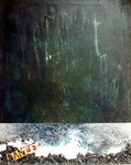 20072e werk uit de serie. Eerst een beetje keurigjes gespet en gespat, want ik wist nu dat het over storm ging,.. Uiteindelijk vond ik het maar niks en stootte per ongeluk een pot met zwart water om, begon met een vaatdoekje op te deppen en boven het doek uit te wringen,.. Toen pas kwam de storm echt tot leven..